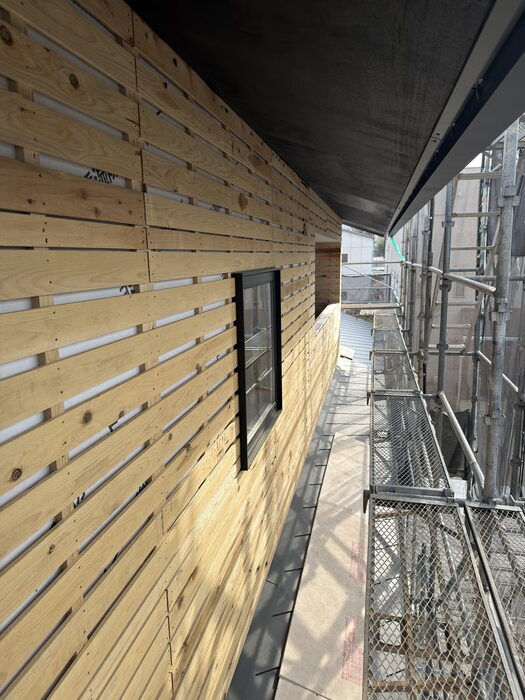 万が一、表面から水分が入った場合でも、その内側でしっかり備えておくことが大切です。お客様から見ると完成後には見えなくなる部分ですが、住まいを長く守るためには、とても重要な層になります。
